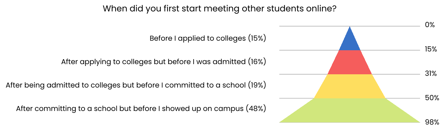 MeetYourClass asked ~3,500 high school seniors 30-40 questions to determine how they made their enrollment decisions. Questions spanned the entire admissions process, ranging from how students curated their application lists to how they narrowed their options down to a single institution (or chose not to attend college at all).