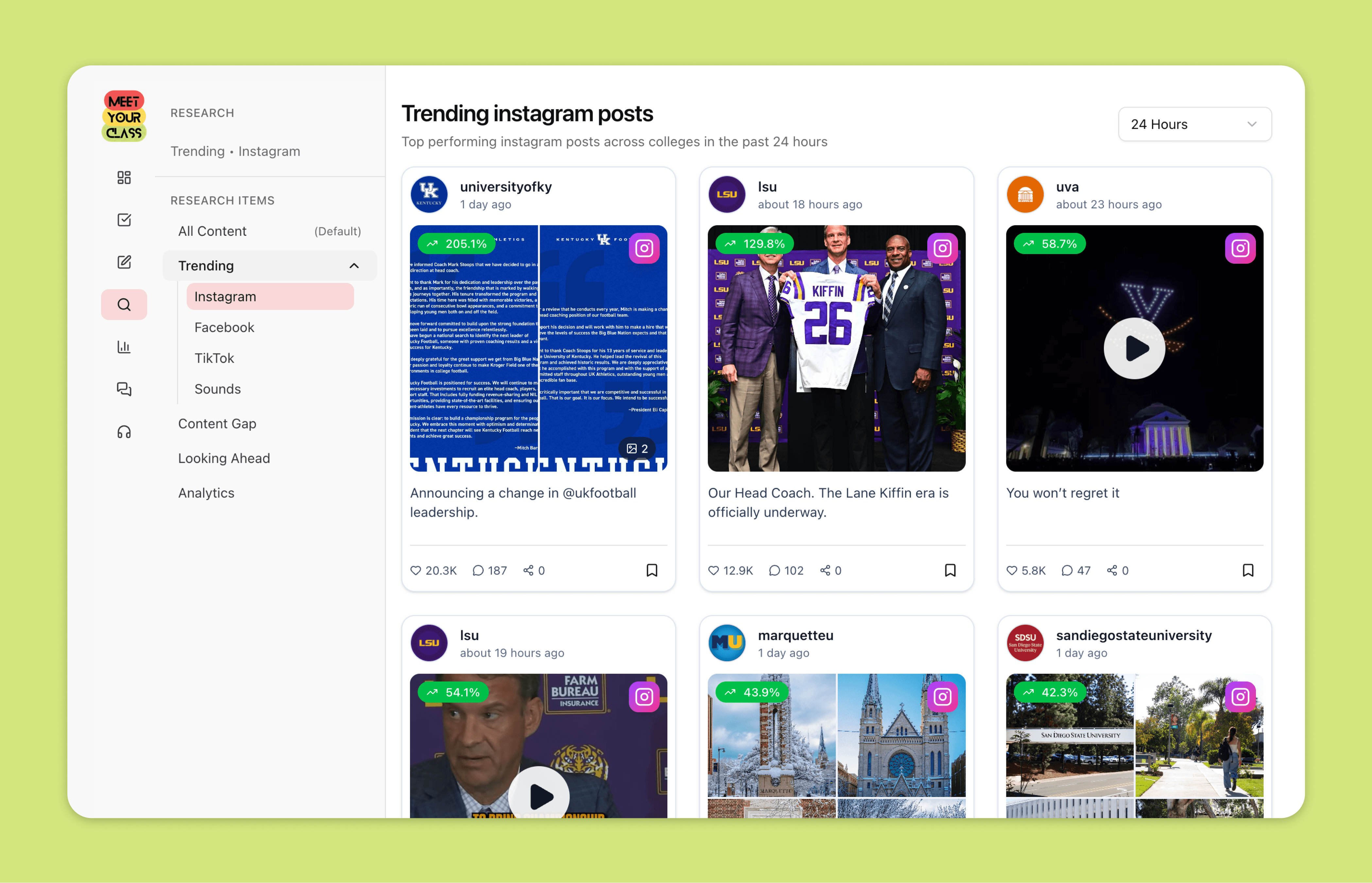 “Discovering MeetYourClass through my daughter was a game changer. Getting started took zero lift or data transfer, and we began seeing engagement and results immediately. Especially with today's students' digital expectations, reaching them organically on platforms they use daily is a must.”